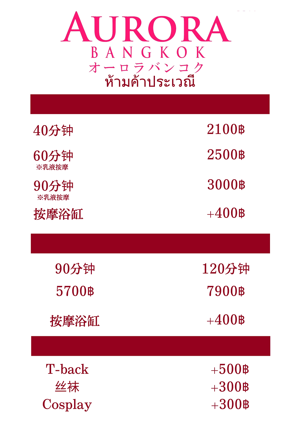 这家店的价格还是很亲民的,最低门槛仅需要2100泰铢就可以进行一个日式全套服务。至于丝袜或者 Cosplay(选制服),就看个人喜好了,我强烈建议选择带浴缸的房间,体验完整版的日式服务,才够过瘾。